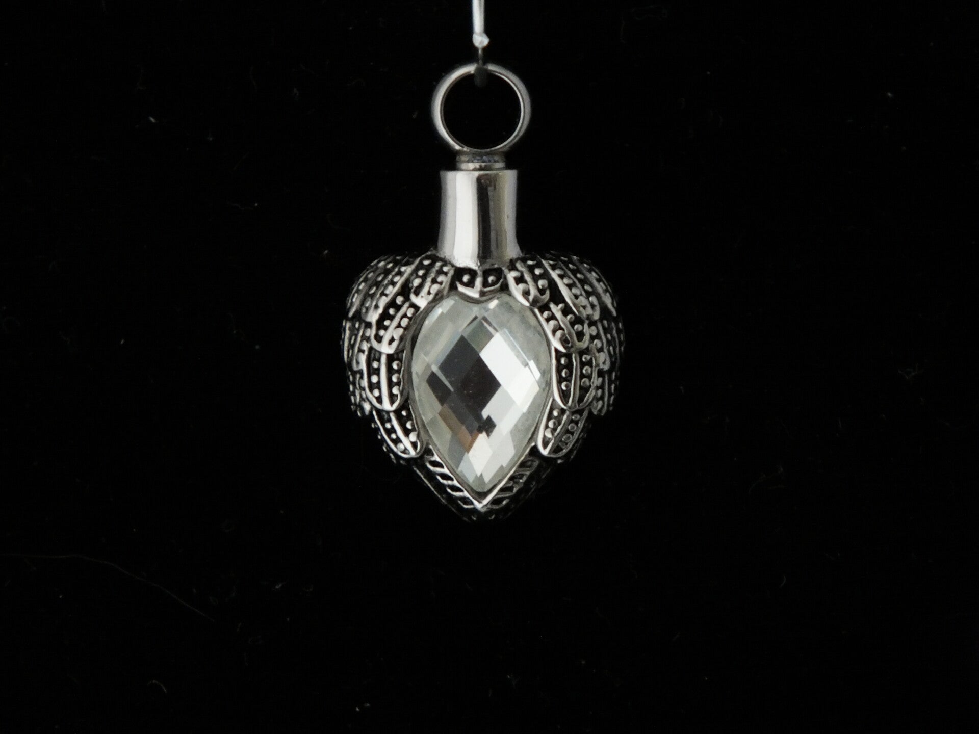 | Kleur: Zilverkleur met een facet geslepen glazen steentje waar een beetje as in gedaan kan worden. | Kleur: Zilverkleur met een facet geslepen glazen steentje waar een beetje as in gedaan kan worden. |